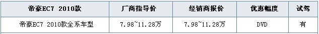网上车市西宁分站讯:网上车市编辑从青海新源汽车销售有限公司帝豪汽车4S店获悉,新年购买2010款帝豪EC7全系送DVD礼包,对帝豪EC7感兴趣的网友们欲购从速。详情请见下表: