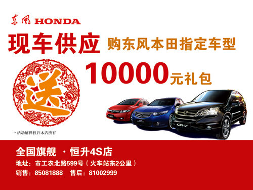 钟声敲响年终的讯息,同时也带来新年的喜讯,为迎接新春的到来,东风本田•全国旗舰•南通恒升4S店特地从厂方调足车辆,全系车型现车供应,同时购东本本田指定车型还送10000元大礼包。
