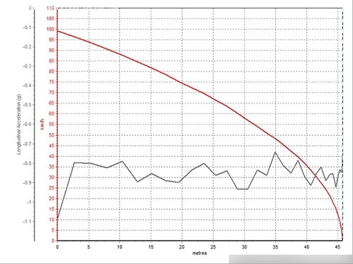 我们来看测试曲线,黑色折线反映了制动时的加速度(反向,显示为负值),可以看出,在刚踏下踏板时制动力最大,反向加速度达到1.1g(g为重力加速度值),而后反向加速度便有所减小,说明科鲁兹的刹车初段制动力度较大,而中后段力度一般。制动时的加速度波动较大,说明其制动力度不均匀,在制动时不够平稳。