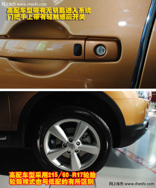 高配车型配置了无钥匙进入系统,在轮胎和轮毂方面也继续采用老款的样式。高配的17寸轮毂充满运动感。随着车市的发展,消费者对车型的产品力、情感价值及增值服务的需求愈加明显,尤其是对那些希望展现自己时尚有型和优越感的都市精英消费者来说,新逍客可以使他们能够通过用车生活来引领潮流、自信地展现自我,舒心地享受备受瞩目的时尚生活。