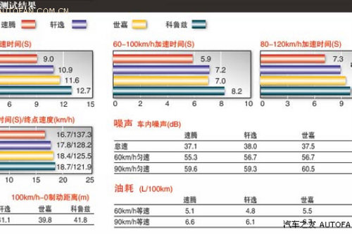 加速性测试的结果似无悬念。所有速度项目上的成绩均由速腾拔得头筹,0-100km/h加速时间为9.0秒,快于第二名的轩逸1.9秒,中途加速的差异也比较明显。和速度相匹配,速腾的制动性能也首屈一指,100km/h-0制动距离为38米,比第二名的世嘉短了1.8米,其余两车则都超过了41米。