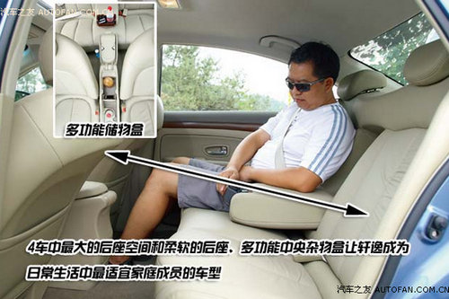 转到车内,轩逸也同样是强者。虽然内饰的材质比较硬,配色年轮和外观相比有些偏老,但却不能否认车内的舒适性堪称4车最佳。新轩逸的后座一看就具有沙发一般的柔软度,我们的摄影师拍摄后窝进去休息,差点直接入梦。轩逸后排中间座脚下的凸台也很低,加上前后方向的腿部空间在4车里最大,达到865mm,比最局促的世嘉多了145mm之多!唯一的缺点是后座宽度小了点,不过已足见这辆车对全家所有人的感受都做了充分考虑,如此看来,牺牲掉操纵性也是值得的。