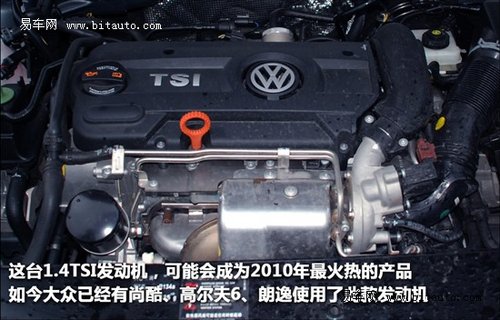 让我们打开发动机盖,来看一下发动机舱的情况。1.4TSI发动机在朗逸的机舱里显得较为紧凑,发动机没有使用太多的包裹件,依然是免维护蓄电池。只是发动机盖上并没有附有隔音棉,估计是考虑到了整个发动机舱的散热,牺牲一些噪音控制也无妨。