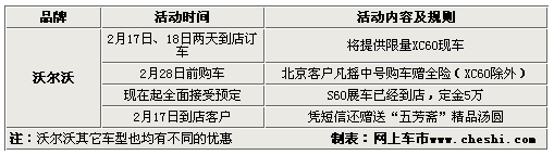 据4S店内的销售人员介绍,传统的元宵节就要来临,现在店内值此元宵佳节,店内举行店内大促销,将提供限量XC60现车(2月17日、18日两天到店订车),现场全系车型皆有优惠。北京客户凡摇中号28号前购车送全险(XC60除外),S60展车已经到店,现全面接受预定,消费者需交定金5万元。2月17日到店客户,凭短信还赠送“五芳斋”精品汤圆。具体的购车详情请咨询店内的销售人员。因各店的订单不同,所售车型也将略有差别。