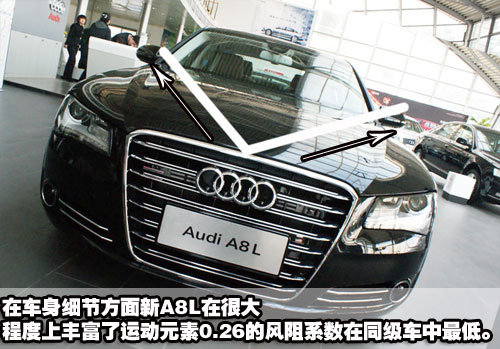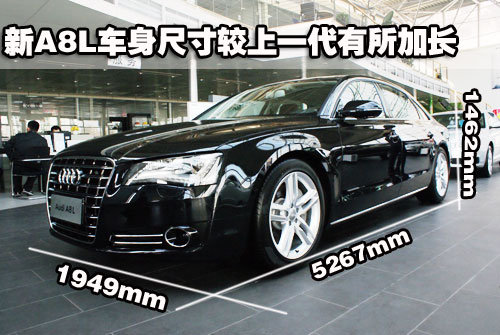 全新奥迪A8L提供了全新的动力搭配,其中包括顶级的W12发动机与两款3.0 TFSI汽油直喷机械增压发动机、8速tiptronic手动/自动一体式变速器和quattro全时四轮驱动系统。全新奥迪A8L将再次完美诠释“突破科技 启迪未来”的不变理念。全新奥迪A8L的外形尺寸再次提升,全长达到5.267米,宽1.949米,轴距的加长使A8L的尊贵感进一步提升。新款A8L的轴距达到了3122mm,相对现款A8加长了130mm。在车身细节方面新A8L在很大程度上丰富了运动元素,视觉效果大幅度提升的同时优化了空气动力学,0.26的风阻系数在同级车中最低。