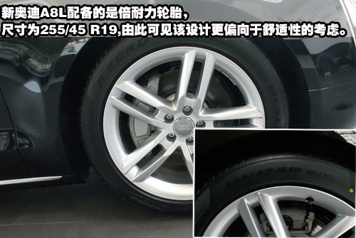 全新奥迪A8L极富动感色彩的车身包含着圆滑的车轮拱罩,拱罩之下转动的是车轮。奥迪A8L的轮毂为5幅的铝合金轮毂,原车配备倍耐力轮胎,尺寸为225/45 R19。保证舒适驾乘的同时,提供了较强的抓地力和稳定能力。