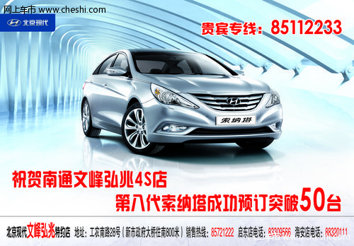 网上车市南通站讯 近日,网上车市编辑从北京现代南通文峰弘兆4S店获悉,自1月6日北京现代第八代索纳塔亮相南通以来,文峰弘兆4S店已经接受客户预订订单突破50台。如之前我们之前所预料的一样,第八代索纳塔赢得了通城车友的广泛青睐,与此同时,我们也有理由相信在取得开门红之后,第八代索纳塔在北京现代文峰弘兆4S店的销量一定会节节攀升,不断创造新的骄人战绩!