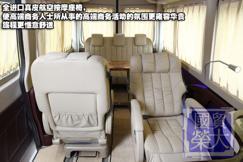 全进口真皮航空按摩座椅,豪华视听墙采用升降式液晶电视作为隐私隔屏,环绕式高保真音响系统。卫星电视接受系统等等奢华设计,使高端商务人士所从事的高端商务活动的氛围更雍容华贵,旅程更惬意舒适。