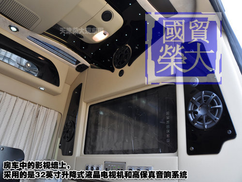 而房车中的影视墙上,采用的是32英寸升降式液晶电视机和高保真音响系统。