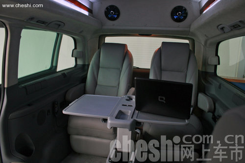 经改装配备了全球定位导航系统GPS、全景天窗、乘客区暖风系统、6碟DVD影音系统、Hi-Fi车载影院系统、皮面内饰、车载冰箱、车载电话等商务功能,极大提升了整车的商务档次。新威霆标配的6幅铝合金轮圈粗壮有力,205/65R 16C运动型轮胎拥有良好的抓地力和舒适性。内部座椅的设计上灵活多变,360度可旋转,从而使空间的宽敞性和灵活性大大增强,满足商务和休闲双重需求。
