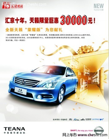 新一代天籁根据“Riding Comfort(舒适享受驾乘乐趣)”的研发理念,以日产高级轿车D平台为基础,汇聚日产全球先进技术精心打造而成,是款性价不错的车型,近日编辑从汇京集团东风日产泉州三家专营店获悉,店内“汇京十年,天籁限量钜惠三万”优惠购车;全新天籁“荣耀版”为您献礼,特别赠送微软+英特尔定制型嵌入式Windows操作系统、3D+3G高性能双导航系统、320G多媒体娱乐中心、场景高保真倒车影像系统等多项尖端科技配置,感兴趣的朋友可以到店咨询或参与我们网站的报名!