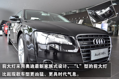 全新A8L的车头与老款车型相比更具霸气,一体式进气格栅轮廓经过镀铬处理并且在每一处细节都设计独到,整个格栅犹如雕刻出的工艺品,极具立体感,格栅的边缘与周围金属外壳完美结合,大量镀铬处理凸显了感官上的区别与A8L独有的高贵。刚劲有力的侧面弧线,以及延伸到头部的V形棱线最终融汇于前大灯总成与进气格栅之间。一体化进气格栅被8条镀铬框水平分开,新设计的前大灯中心略向外移,加上车头两侧的2组独立横向格栅,以及特意安置在较低的位置的整流板,营造出全新奥迪A8L的恢弘气势。