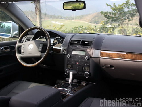途锐的内饰保持了德国车一贯的精致和严谨,均匀的缝隙和丝丝入扣的装配是大众汽车的一贯作风。秉承辉腾风格的内饰有着奢华的气息,真皮、实木和金属饰条配合得稳重又不失活泼。漂亮的如繁星般的各种控制键将中控台打扮得好像飞机驾驶舱,但恐怕要熟悉一段时间才能使用自如。布置在排挡杆后方的空气悬挂和自动水平控制、减震特性和差速锁三个旋钮倒是清楚、方便。