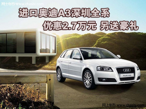 【网上车市】奥迪A3拥有运动时尚的外型和出色的操控性能,主要面向年轻消费群体,作为奥迪品牌的产品,其配置和做工都更具有豪车风范。编者从深圳新奥了解到,近期来店购买进口奥迪A3全系可享受2.7万元的现金优惠,并有好礼送!对这款车有意向的网友不妨到店进一步了解。详细请咨询:0755-33002601。
