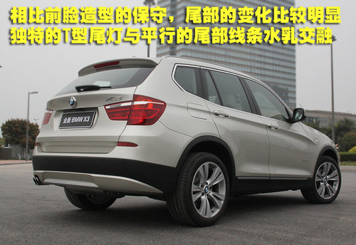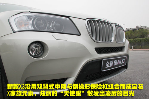 新款X3沿用双肾式中网与倒梯形保险杠组合而成宝马X家族元素,炫丽的“天使眼”散发出凌厉的目光。虽然前脸和之前的区别不大,但是宝马耐看的前脸在任何时候都不会显得落伍。