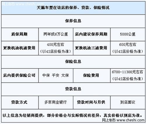 2011款天籁享受2年(或)6万公里整车质保。首保厂家建议在5000公里左右进行,之后每5000公里左右进行一次更换机油机滤的常规保养,费用参照老款大概在350-500元区间,大保养根据车况而定,一般价格在800元上下,养护成本同级车型中等水平。