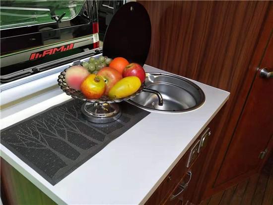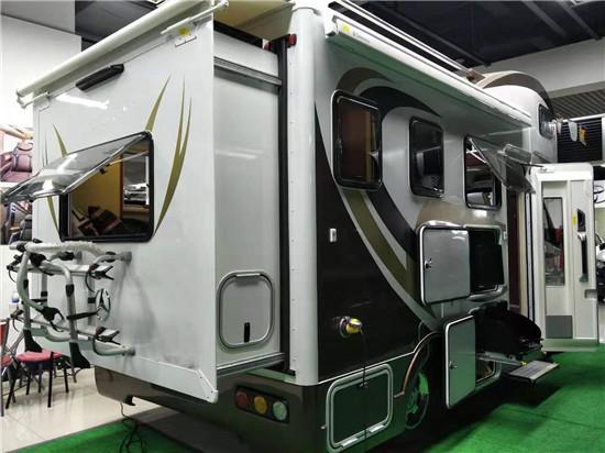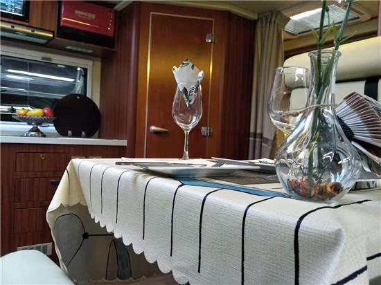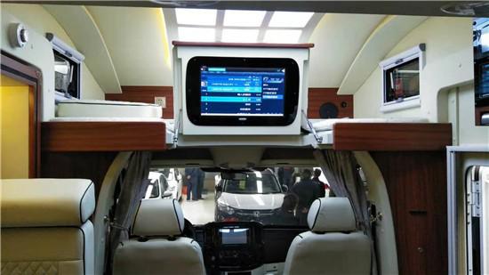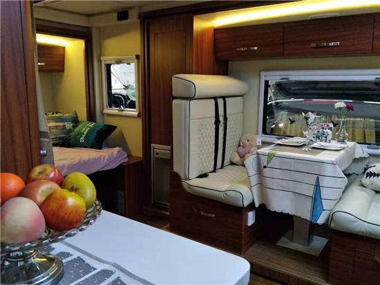 通透的车厢采用了经典的前中后的布局,符合国人的生活习惯,前部为卡座沙发可变儿童床、储物柜,上方为电动升降床,中部为厨房+卫生间,尾部为环形沙发和多功能桌,也可变换成双人床。