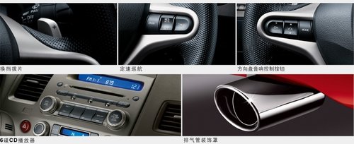 CIVIC(思域)精致升华版EXi车型加装换挡拨片、定速巡航、方向盘音响控制按钮、6碟CD播放器以及排气管装饰罩五大配置,独揽完美操控和精致娱乐于一身,让乘驾享受更进一步;CIVIC(思域)精致升华版VTi、VTi-S车型加装CIVIC(思域)专属智能导航仪,并免费赠送超值车险,为车主带来日常用车便捷的同时,出行更有保障。