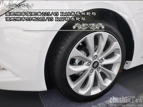 第八代索纳塔2.4L和2.0L高配版本配备了五幅式运动造型轮毂与米其林轮胎,运动感以及视觉性上都更为抢眼。低配版本则配备了尺寸小一号的17寸轮毂,轮胎品牌也调整为韩泰。