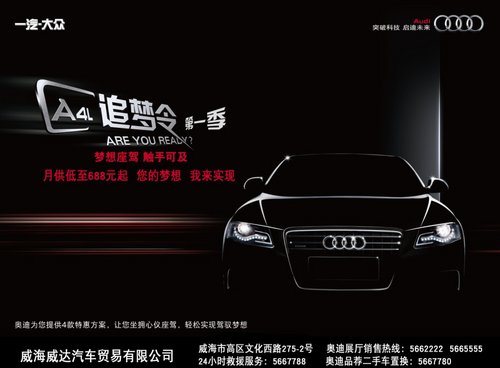 【威海网上车市讯】你的梦想伫立在更遥远的地方,追梦的脚步岂能在一辆轿车前停留?奥迪A4L月供低至688元起,为您提供4种金融特惠方案,让您轻松拥有心仪座驾,去追寻更前方的梦想。