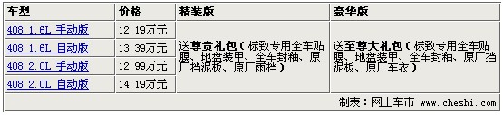 礼包:凡订购精装版408车型,加送尊贵礼包(标致专用全车贴膜、地盘装甲、全车封釉、原厂挡泥板、原厂雨档)