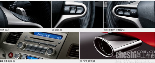 CIVIC(思域)一向以精致内饰为傲,精致升华版在内饰方面的表现自然不会让广大消费者失望,新增6碟CD播放器的配置尤其贴心,让音乐选择更丰富,并增加对MP3、WMA文件的支持,畅享旋律配合驾乘的动感。升级后高质感的三幅多功能方向盘上,增添音响控制按钮,让驾驶者简单操作即可实现曲目、音量和音效的改变。