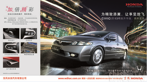 【网上车市唐山讯】作为充分诠释东风Honda“安、环、省、乐”理念的经典之作,CIVIC(思域)精致升华版3月1日焕新上市,即刻俘获了广大都市精英的芳心。在保持原有价格和让利幅度不变的情况下,加装换挡拨片、定速巡航、方向盘音响控制按钮、6碟CD播放器以及排气管装饰罩五大配置,提供更舒适愉悦的驾乘体验,1.8L之王的性价比优势再度升级。