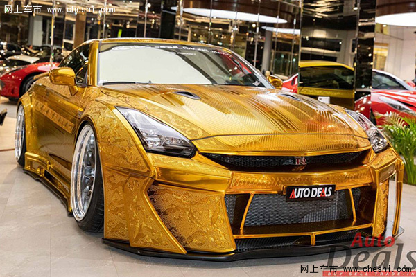 新车或可谓“最闪亮”的日产GT-R,其车身采用了带有复杂纹理的金色涂装,并配备造型夸张的车身套件,包括前保险杠、黑色前唇、定制尾翼、具有通风口的侧裙。新车同时还配备多辐式枪灰色轮毂,搭配超低扁平比轮胎。由于车身悬架进行了优化,新车离地间隙进一步降低,视觉感受上更为低趴。