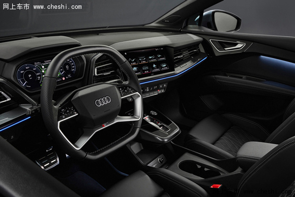 奥迪Q4 e-tron内饰使用了不同以往的全新设计,营造出前卫、新鲜的感觉。中控台设计轻盈简约,丝毫没有臃肿的感觉,大量横向线条以及RGB氛围灯带来了十足的层次感,方向盘采用了全新的上下平底式四辐方向盘,运动感尽显。