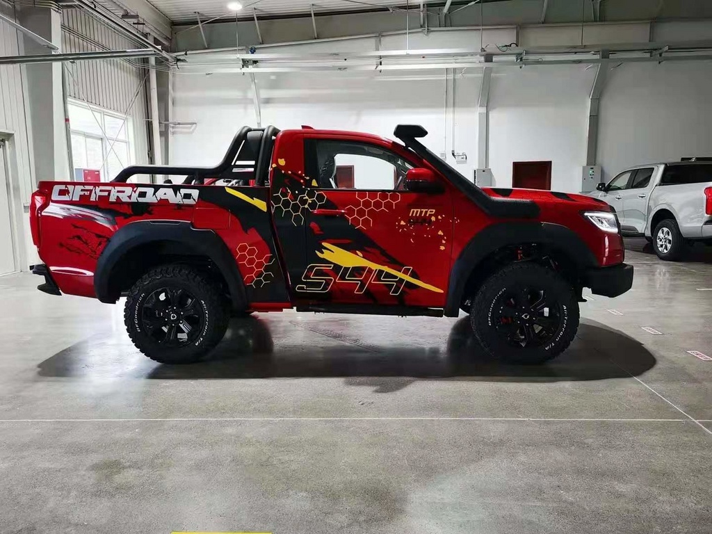 从曝光的照片来看,长城炮单排版车型以长城炮越野皮卡为设计基础,以红色为主色调,辅以大量熏黑部件,独具狂野气质。并且从外观来看,绞盘、涉水喉、铁质竞技杠、全地形轮胎、运动化龙门架都没有缺席。
