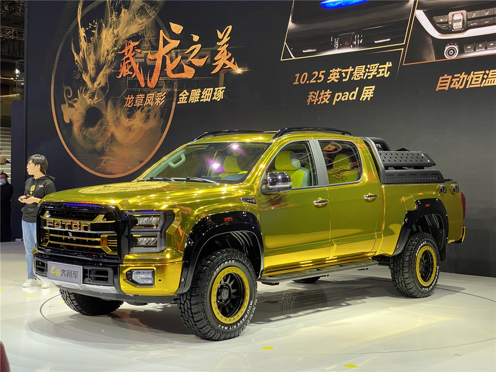 龙腾大将军基于普通版车型打造,整车以亮金色为主体涂装,并在“FOTON”标志、进气格栅、头灯、轮毂等多处加入描金细节,并装配了金属侧踏板、275mm越野轮胎、越野风格龙门架,值得注意的是,该车还配备了尾门缓降功能。