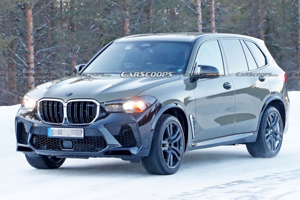 宝马新款X5 M前脸装配了经典的炭黑双肾进气格栅,周围加装了亮色金属镀铬饰条进行点缀,下方格栅采用了熏黑网状造型设计。车身侧面装配了多辐式铝合金轮毂,并提供了犀牛角反光镜罩。车尾依旧选用了双边双出式排气布局,上方尾灯组造型相比现款车型更为狭长。