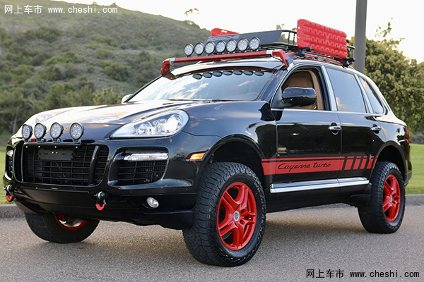 近日有海外媒体曝光了一组保时捷卡宴改装版车型的实拍图片。实拍车辆基于Cayenne Turbo打造,车身上装配了诸多与越野相关的配件,其中格栅上方加装四个照明灯,车顶前部增加7个照明灯,车顶还配备了疑似金属材质的行李架,侧面装有红色防护板。