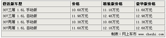 此次推出的标致307精装版、豪华版都是在舒适版的基础上增加了多种配置。配置升级,价格不变!