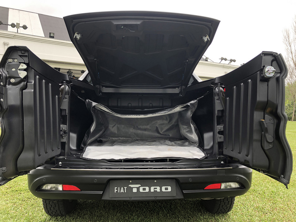此次的菲亚特Toro Ultra采用了全黑色涂装,包括进气格栅、车标、后视镜、轮毂等多处都被涂装成纯黑色。作为高配版车型,菲亚特Toro Ultra最大的不同在于原厂配备了货箱盖和三面开的货箱尾门,同时还有Mopar的行李袋,可以通过6个锚点连接,据悉货箱的容积为820 升,行李袋的容积为407升。