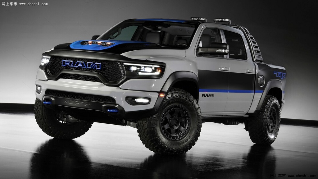 RAM 1500 TRX RexRunner主打极限越野性能,搭载原厂道奇地狱猫动力6.2升超级增压HEMI V8发动机,可迸发出523kW功率和880N·m扭矩,拥有37英寸大号全地形轮胎和定制轮毂。Mopar对Ram TRX进行了细节升级,采用Mopar Blue风格定制发动机舱盖、车身拉花、前脸格栅和拖车钩,底盘进行升高使接近角达到了32.5度,并安装了带有Mopar字样的定制底盘护板。