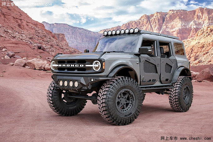 外观上,新车整体造型依旧十分硬派,车身造型方正,车底配备了全新设计的37英寸全地形越野轮胎。新车前脸配备了造型复古的圆形大灯,格栅处带有BRONCO字母标识,下方带有四个前照灯,前脸挡风玻璃上方还带有8个前照灯。车身侧面来看,新车配备全新设计的车门,新车底盘离地距离很高,并且底盘还具有可升降功能。此外,新车尾部还配备了全尺寸备胎。