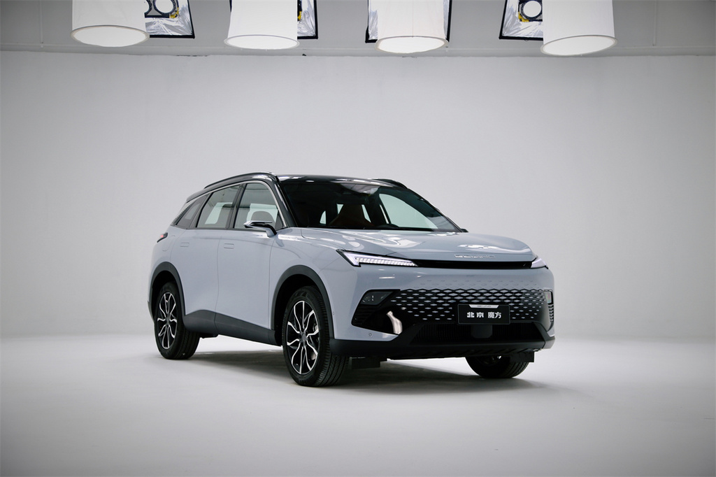 首先我们来看一下魔方的外观设计,这款车第一眼看上去会给人一种“纯电动车”的错觉,而形成这种错觉的原因之一便是前脸采用的封闭式设计。官方将这样的封闭式进气格栅命名为“星空格栅”,点阵式造型被双色车身划分为上下两个部分,层次感很强,相比北京汽车旗下的其它产品都更时尚一些。
