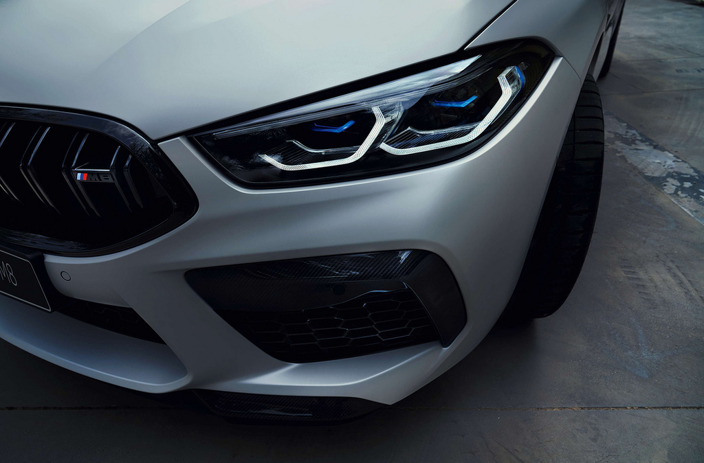 新车标配智能激光大灯,含自适应弯道照明功能和动态光束防眩目远光自动控制功能,确保在所有天气条件和驾驶情况下保持最佳能见度。新BMW M8还可选装个性化定制黑色大灯装饰条,这也是该配置首次应用于豪华高性能车型。大灯内的深色镶嵌和镀铬细节使汽车前脸极具辨识度和运动感;双肾格栅周围标配黑色高光装饰条,进一步强化了视觉表现力。