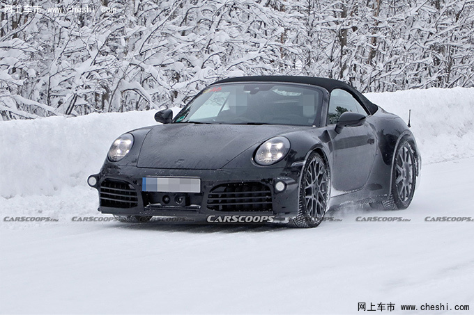 外观方面,从外媒发布的新车谍照图来看,新车依旧采用911经典的造型设计,前脸配备圆形大灯组,下方进气格栅造型进行了小改,两侧配备了一组额外的行车灯,造型更加激进。侧面来看,新车采用双门软顶敞篷结构,下方采用全新的大尺寸轮毂,轮毂造型更加运动。车尾部分仍配备贯穿式尾灯,尾部下方大部分区域被雪覆盖,可观察到的细节还比较少,排气系统仍将采用中置排气布局。