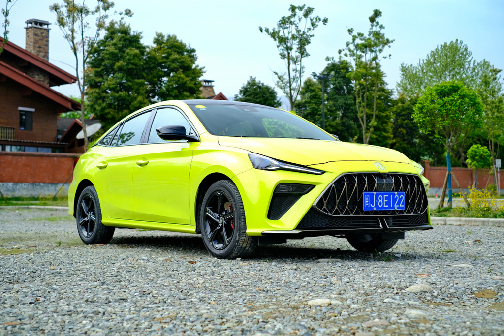 当然除了主打色激情柠涂装之外,还可以选择雪山白、赛博灰、曜石黑、核能黄、海岛蓝和赤焰红。MG5天蝎座的车身侧面有明显的溜背效果,整个车顶的线条前高后低,配合上车门位置灵动的腰线,这台车不仅拥有运动感同时也兼顾了一些力量感。而且可以看到细节方面还采用了大量的熏黑处理,包括车窗边框、外后视镜以及轮圈等,进一步强调运动风格。