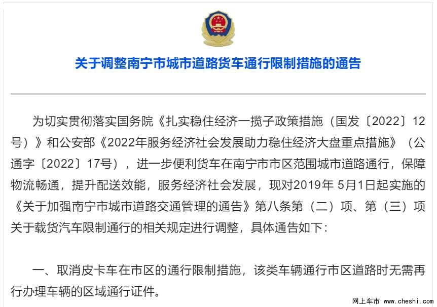 日前,广西南宁公安局交通警察支队发布《关于调整南宁市城市道路货车通行限制措施的通告》,决定自2023年1月1日起,取消皮卡车在市区的通行限制措施,该类车辆通行市区道路时无需再行办理车辆的区域通行证件,有效期至2024年4月30日止,原通告相关规定与本通告不相符的,以本通告为准。