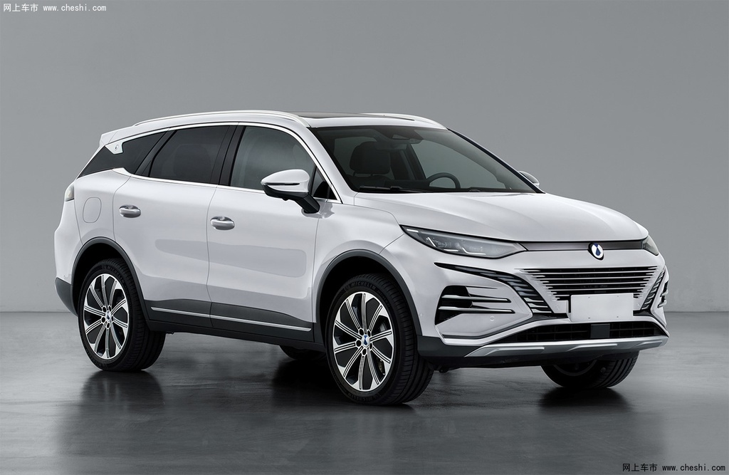 腾势N8纯电版前脸采用封闭式格栅,混动版为横幅式格栅;侧面采用悬浮式车顶设计,D柱位置增加品牌LOGO,提供3种样式的多辐轮毂。