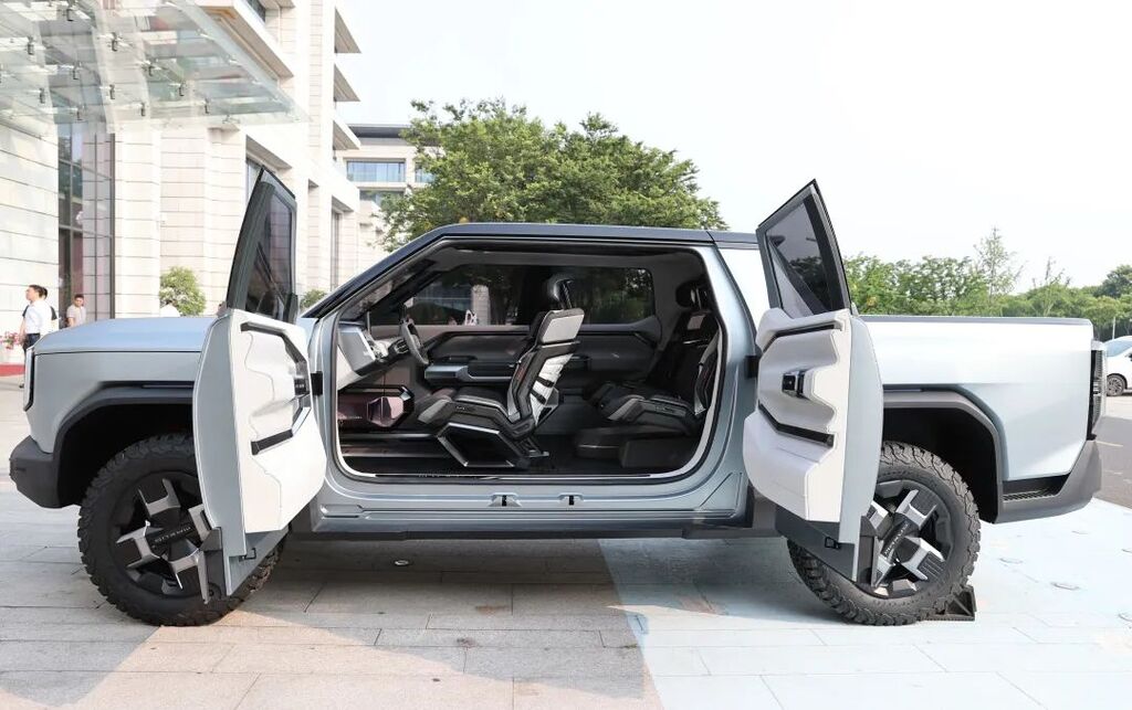 上汽大通GST皮卡采用全新半固态电池,续航里程预计超过1000公里。它由4个独立高性能电机组成分布式电驱系统,最大马力可高达1000Ps,峰值扭矩达14000牛·米。也因此,美国皮卡新势力Rivian通过4电机独立控制车轮旋转实现两侧车轮反转,从而达到了和坦克两侧履带反转一样的效果,实现货真价实的原地旋转机动的坦克掉头技术,GST皮卡预计也可实现。