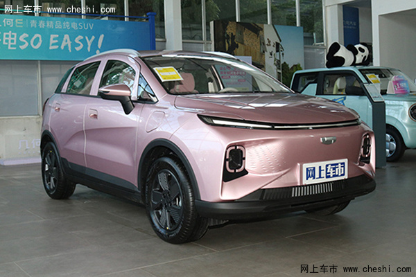 几何E萤火虫前脸采用封闭式格栅搭配分体式大灯组,上方配贯穿式日行灯,两侧方形LED大灯周围有多彩饰条点缀。车侧采用双色车身设计,腰线与隐藏式门把手结合,车尾配备运动双尾翼,中央为“GEOME”字母标识。