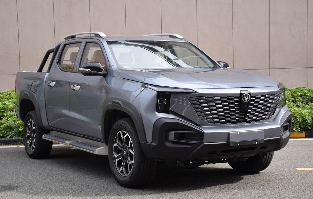 回到产品本身,外观方面新车亮相有两套前脸设计风格。一款与目前在售的长安览拓者皮卡相近,大量粗壮线条的应用赋予了其正中美感,展现出了作为一台皮卡的硬派气息。而需要重点说明的是“猎手”皮卡亮相了长安在皮卡领域的全新外观设计语言,与其乘用车领域的UNI系列类似。前格栅采用鳞片式造型并搭配无边框设计,显得很有未来感,前大灯组则设计的颇为狭长,营造出不错的年轻感。