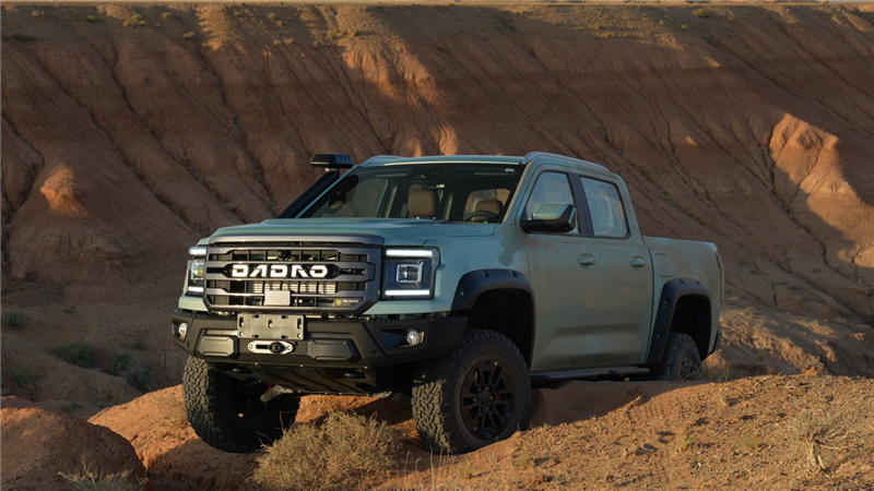 外观部分,大道飞将整体沿袭了大道敢探者的设计语言,并根据运良“高调不张扬,低调不浮夸”的理念对一些细节部分进行了改动,提升了个性化设计程度和越野针对性防护。例如发动机舱盖采用凸起式设计,使得整车更具硬派越野氛围。