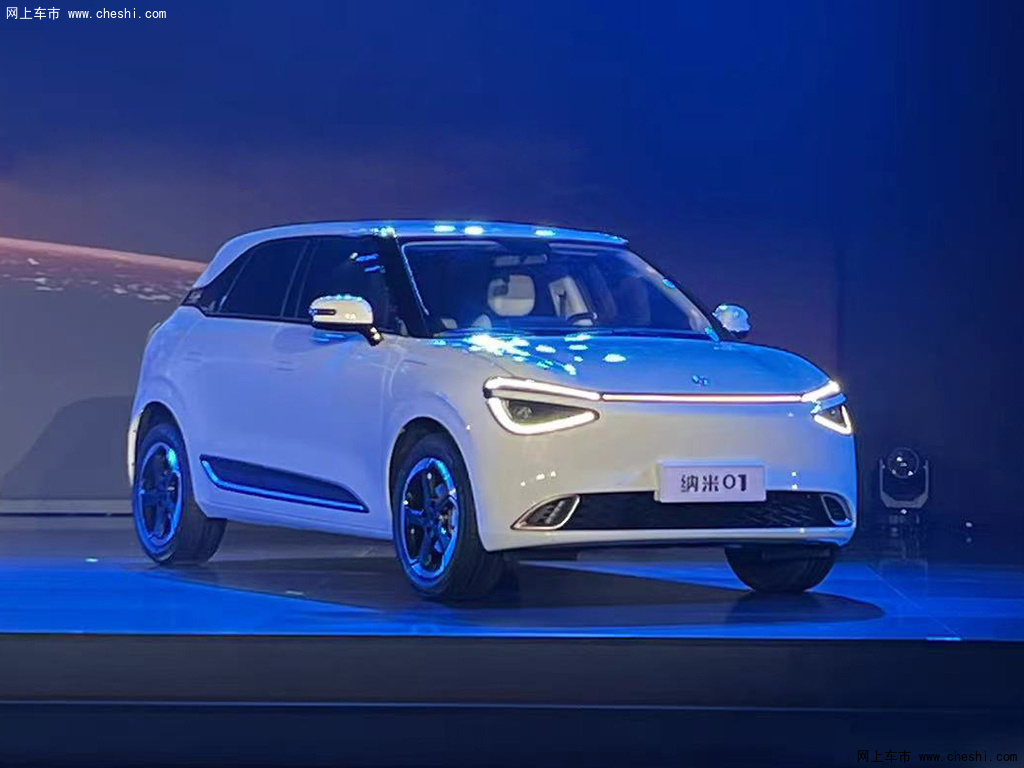 纳米01前贯穿式灯带连接两侧C字形灯组,下进气口配有镀铬装饰。车侧配备隐藏式门把手,右前翼子板处提供充电口。新车采用双色车身,尾灯组造型圆润,顶部配有高位刹车灯和导流槽。