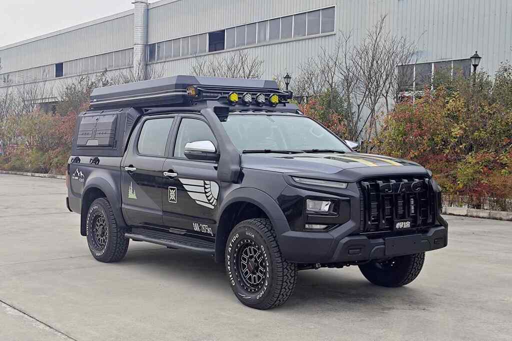 江淮全新悍途宿营车装有宿营帐篷、宿营床、宿营灯、车载冰箱、盥洗池、炊具等,主要用于户外宿营。车辆在行驶状态下顶部宿营帐篷处于关闭状态且顶部宿营灯不可开启。新车随底盘可以选装侧踏板、红色减震弹簧、红色卡钳、涉水喉、前绞盘、前格栅、外后视镜颜色、不同风格轮辋等。该车型可选装直接供电式ETC车载装置。后轴采用钢板弹簧悬架改装。