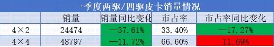 首先从宏观来看,四驱皮卡销量基本达到两驱车型的2倍,而受限于今年前三月整体销量较去年有所回落,故两驱/四驱皮卡销量均同比下降。但需要注意的是两驱皮卡同比下降达37.61%,而四驱车型仅为11.72%。市占率也很好的反映了目前国内市场对于四驱皮卡的需求,已经达到66.6%,较之去年同期上涨11.69%。